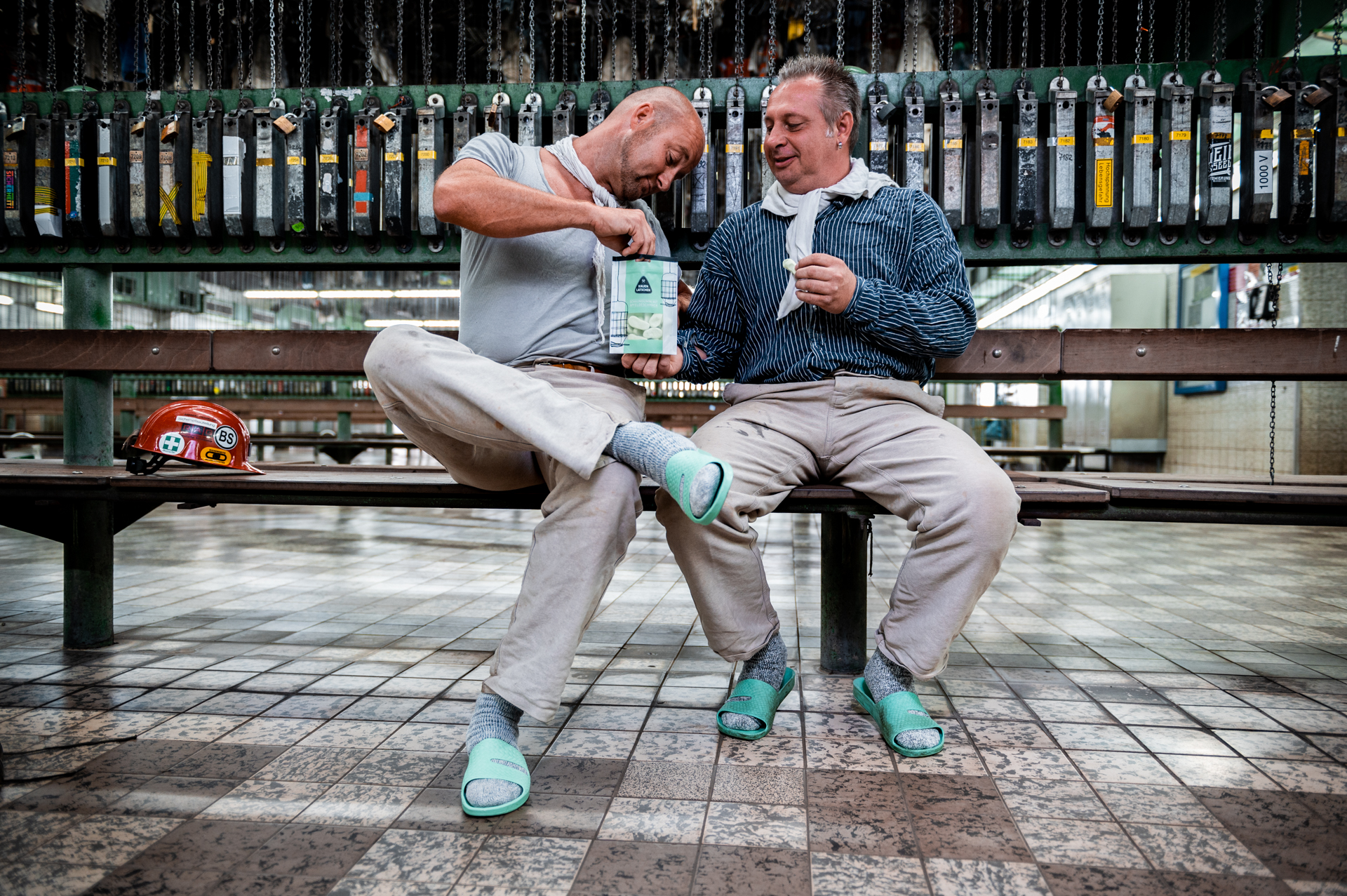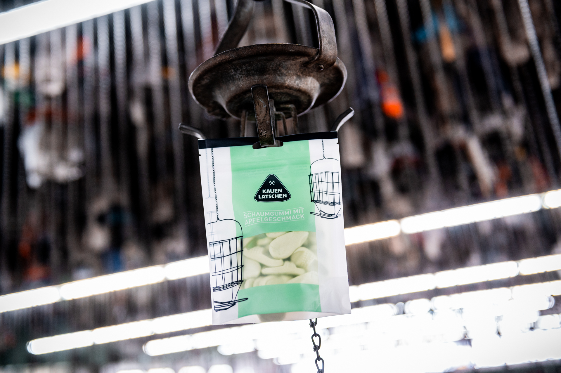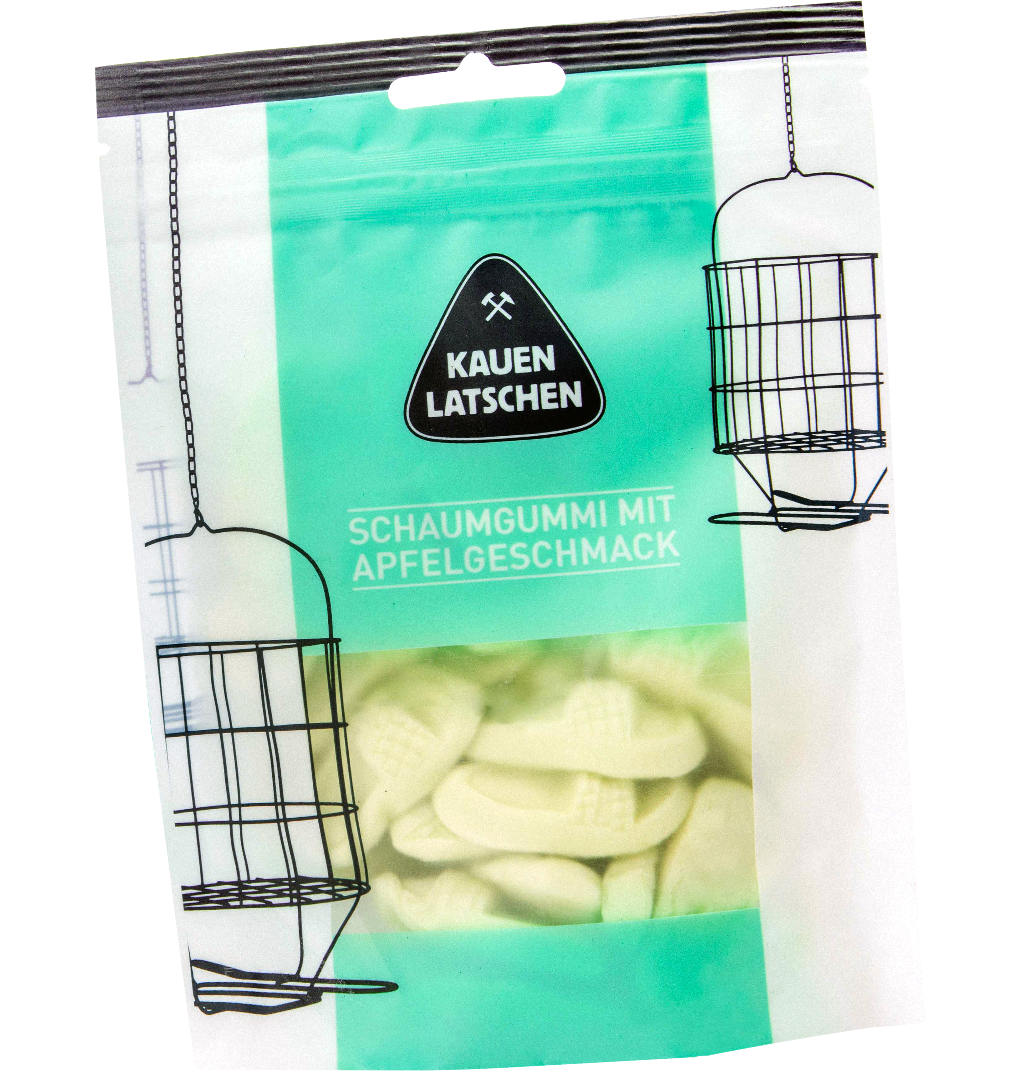 So mintgrün wie die Schlappen vonne Bergleute – unsre kleinen Kauenlatschen zum Kauen. Lecker Schaumgummi mit Apfelgeschmack, natürlich fair produziert und nix mit Gluten oder Lactose. Komm ey, besser geht et echt nich!